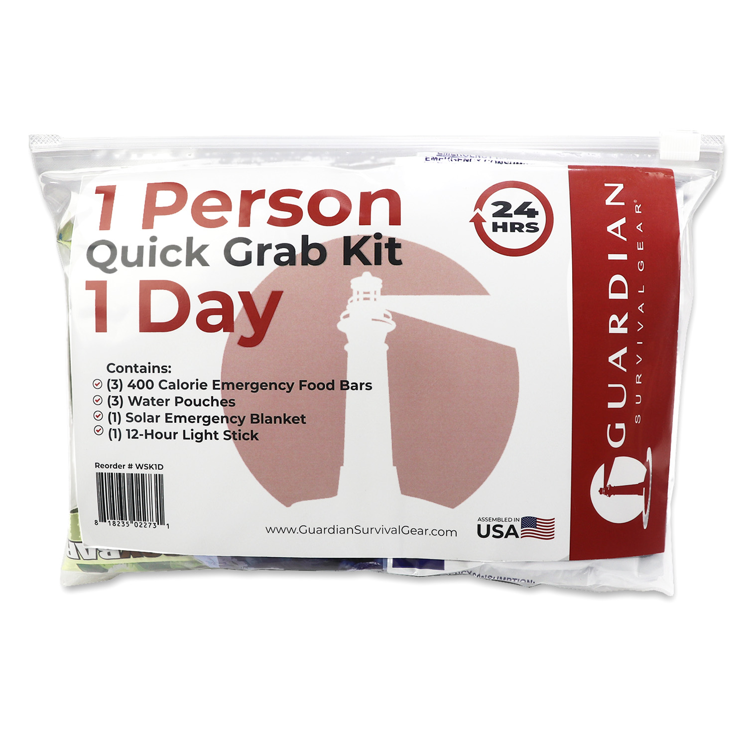 Be ready for any emergency with the 1 Day Quick Grab Kit. This lightweight, compact kit is packed with essential survival items for one person, all conveniently stored in a resealable bag for easy access and portability.