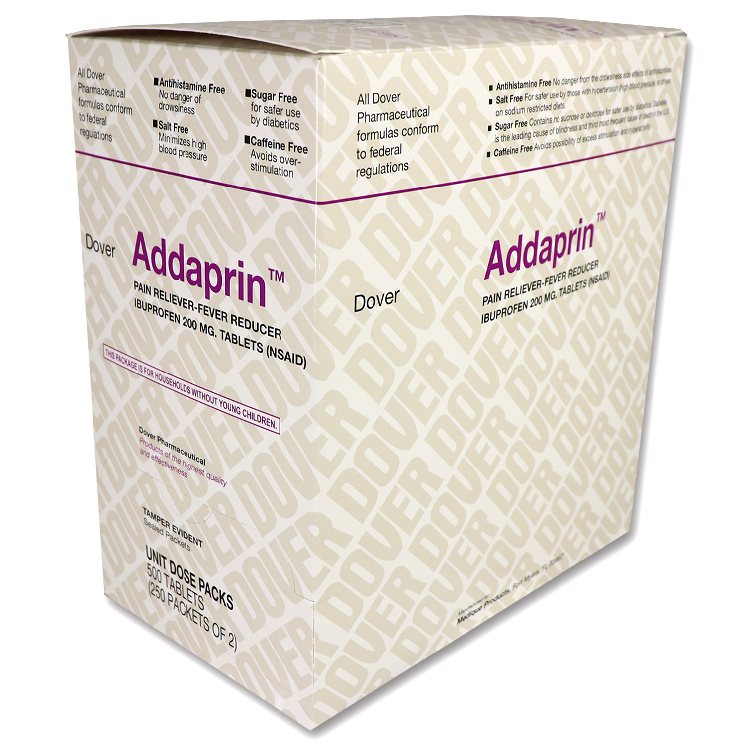 Addaprin, 500 tablets per box, 250 packets of 2 tabs each