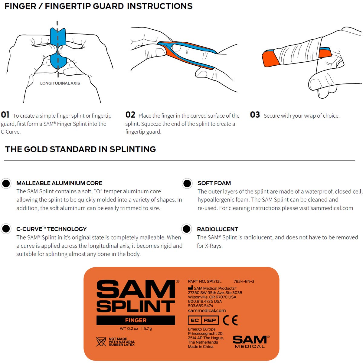 • Soft foam – Waterproof, closed cell, hypoallergenic foam. The SAM® Splint can be cleaned and re-used.